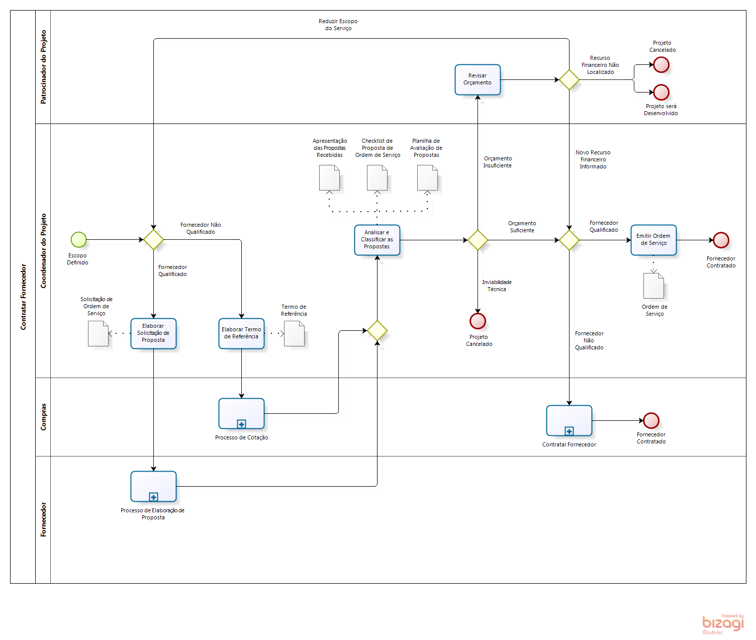 Após selecionar um fornecedor qualificado para executar o projeto, dentro do orçamento, será emitida uma ordem de serviço formalizando a contratação do fornecedor para executar o projeto.