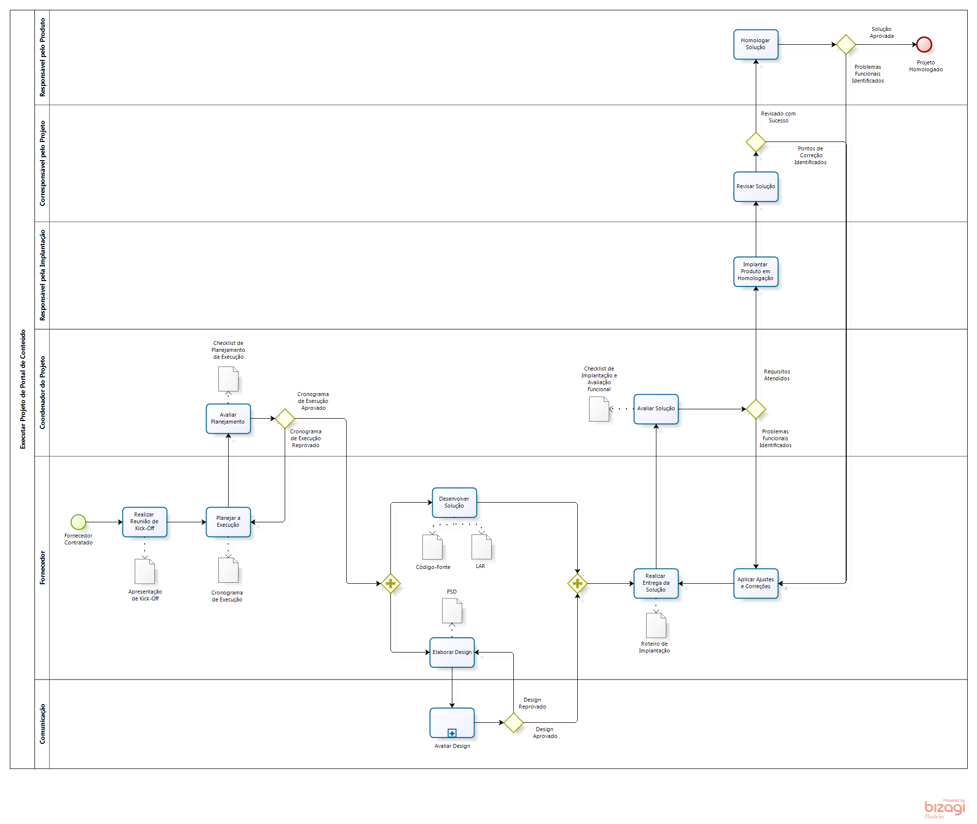 Este processo representa as atividades necessárias para executar o projeto que consiste no trabalho que será realizado pelo fornecedor para desenvolver um site institucional ou de eventos com conteúdos predefinidos e funcionalidades já existentes no ambiente de portais. A atividade de homologação também está inclusa neste processo.