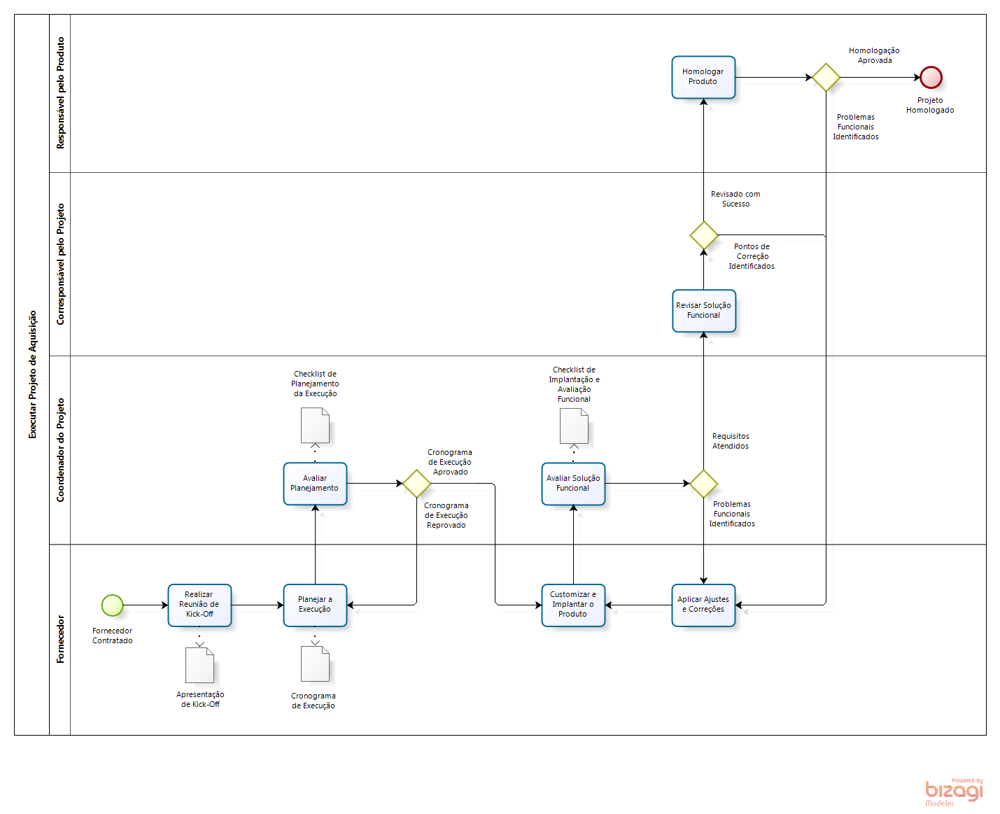 Este processo representa as atividades necessárias para executar o projeto que consiste no trabalho que será realizado pelo fornecedor para implantar ou disponibilizar o produto/serviço contratado. Também está contemplada a adaptação ou a customização do produto, quando necessário.
